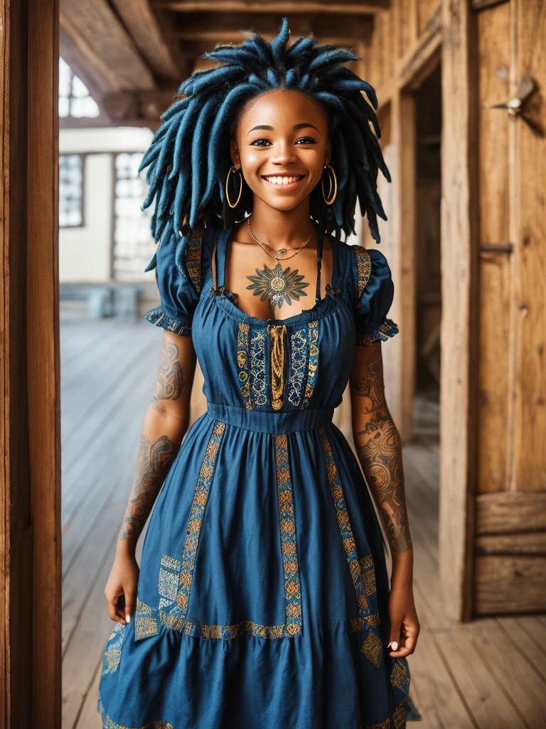 blue hair, purple eyes, sharp ears, tattoos, piercing